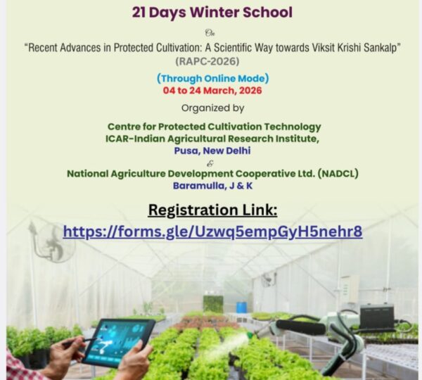 A 21 Days Winter School titled “Recent Advances in Protected Cultivation: A Scientific Way towards Viksit Krishi Sankalp (RAPC-2026)” will be conducted from 04 to 24 March 2026 through online mode. The programme is jointly organized by the Centre for Protected Cultivation Technology (CPCT), ICAR–Indian Agricultural Research Institute (IARI), Pusa, New Delhi, and the National Agriculture Development Cooperative Ltd. (NADCL), Baramulla, Jammu & Kashmir.